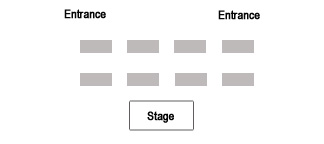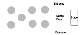 The following layouts make the performance difficult. If the stage is surrounded, some tables can’t see the show and lose interest. They will eventually start to talk, ruining the show for everyone. If there is a dance floor between the audience and the performance area, it will act like a barrier, and the audience will feel like they don’t need to participate. You might as well fill it with alligators! Also, the entrances are by the stage.