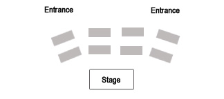 The first 3 layouts will make for a great show. All of the tables are in front of the performance area, and the entrances are at the back of the room, so guests don’t have to walk in front of the stage if they arrive late or have to go to the restroom. The round tables work great for banquets, awards dinners, and galas. The rectangle tables are great for seminars and meetings.